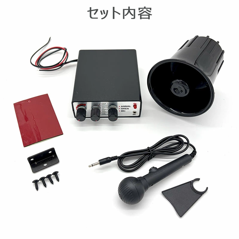 | 仕様 | 素材:ABS 電源:DC12V 、アンプ出力20W アニマルサウンド:ウマ、ニワトリ、イヌ、ウシ、ネコ サイレン:UFO、救急車、エマージェンシー、USパトカー、サイレン セット内容:ホーン・コントロールユニット・マイク・取付金具・ビス パッケージサイズ:約 H115×W170×D150(mm) 重量:約0.75Kg 適合:車用(DC12V専用)のホーンです。 付属のマイクをつなげれば、拡声器としても使えます。 3.5mm(モノラル)のミニプラグであれば、マイク以外も接続は可能です。 |